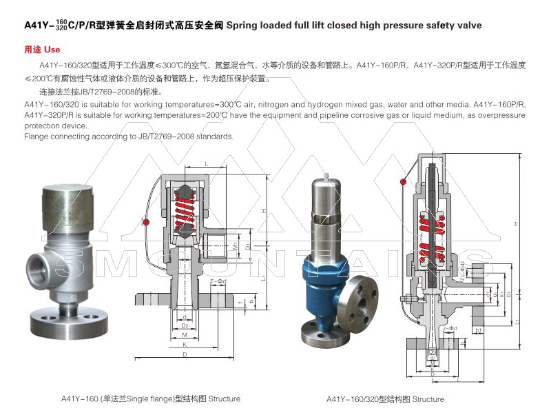 A41Y-160/320型彈簧微啟封閉式高壓安全閥適用于工作溫度≤200℃的空氣、氮?dú)浠旌蠚狻⑺冉橘|(zhì)的設(shè)備和管路上。A41Y-160P/R、A41Y-320P/R型彈簧微啟封閉式高壓安全閥適用于工作溫度≤200℃有腐蝕性氣體的設(shè)備和管路上,作為超壓保護(hù)裝置。